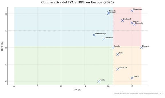 España ha pasado de una presión fiscal moderada a situarse entre los países con un IRPF más elevado de Europa, mientras mantiene un IVA en la media baja. El verdadero desafío no reside en subir o bajar tipos, sino en lograr un sistema eficiente, justo y sostenible que recaude sin frenar la economía. Podemos decir que en un contexto europeo de convergencia fiscal, cada país sigue reflejando su propio modelo económico y social a través del equilibrio entre recaudación, inversión y equidad.