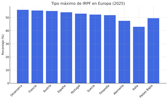En España, el tipo máximo marginal alcanza aproximadamente el 54 % si se suma el tramo estatal y el autonómico, aplicable a rentas muy altas. Esto coloca al país entre los de mayor presión fiscal sobre las rentas personales dentro de la Unión Europea.