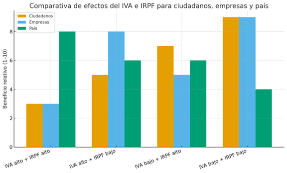 En definitiva, un sistema fiscal equilibrado debe recaudar sin frenar la economía y ser capaz de financiar el bienestar sin comprometer el crecimiento, combinando un IVA moderado y un IRPF progresivo dentro de una política fiscal coherente y sostenible.