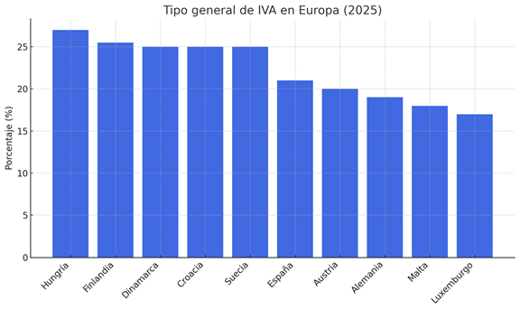 Comparando con el resto de Europa, España se encuentra en una posición intermedia. Países como Hungría (27 %), Finlandia (25,5 %), Dinamarca, Suecia o Croacia (25 %) aplican tipos más altos, mientras que Luxemburgo (17 %), Malta (18 %) y Alemania (19 %) mantienen una carga menor sobre el consumo. En conjunto, la media europea del IVA ronda el 22 %, lo que sitúa a España ligeramente por debajo del promedio.