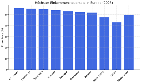 Zum Vergleich: Die Länder mit den höchsten Spitzensteuersätzen sind Dänemark (55,9 %), Frankreich (55,4 %) und Österreich (55 %), während andere wie Portugal (53 %), Schweden (52,3 %) und Finnland (51,8 %) ähnliche Werte aufweisen. Am anderen Ende der Skala liegen Italien (43 %) und Deutschland (47,5 %) mit einer geringeren Belastung.
