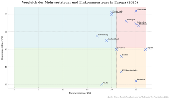 Eine hohe Mehrwertsteuer erhöht zwar die Staatseinnahmen, verringert jedoch die Kaufkraft und den Konsum und belastet insbesondere einkommensschwache Haushalte; eine niedrige Mehrwertsteuer stimuliert hingegen die Binnennachfrage, kann jedoch zu Defiziten führen.