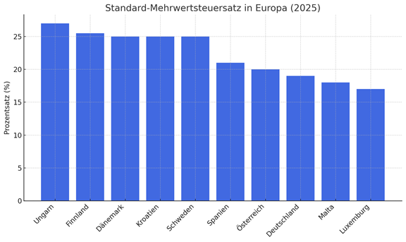 Im europäischen Vergleich liegt Spanien im Mittelfeld. Länder wie Ungarn (27 %), Finnland (25,5 %) und Dänemark, Schweden oder Kroatien (25 %) erheben höhere Sätze, während Luxemburg (17 %), Malta (18 %) und Deutschland (19 %) eine geringere Steuerbelastung auf den Verbrauch anwenden. Im Durchschnitt liegt der europäische Mehrwertsteuersatz bei etwa 22 %, womit Spanien leicht unter dem europäischen Durchschnitt liegt.