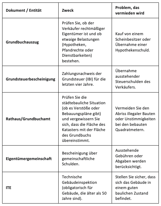 Unbekannte rechtliche Belastungen (Hypotheken, Pfandrechte, Nießbrauchsrechte). Es empfiehlt sich, eine aktualisierte Nota Simple anzufordern und diese sorgfältig zu prüfen, um Eigentümer, Belastungen und Beschränkungen zu überprüfen.