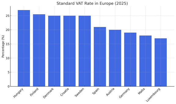 Compared to the rest of Europe, Spain is in a middle position. Countries such as Hungary (27%), Finland (25.5%), Denmark, Sweden or Croatia (25%) apply higher rates, while Luxembourg (17%), Malta (18%) and Germany (19%) maintain a lower tax burden on consumption. On average, the European VAT rate stands at around 22%, placing Spain slightly below the continental average.